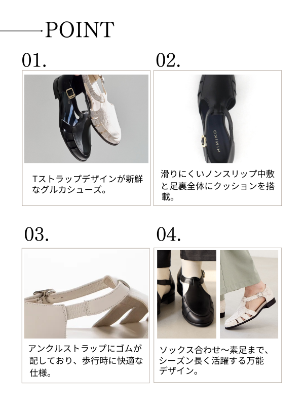 アンクルストラップが足首にアクセントをプラスしつつ、脱げない安心感があるのも魅力。 ブラック、オフホワイトはデイリー使いにぴったりなスムースレザー、Lグレーはマットなパイソン柄のレザーでお洒落に履いていただけます。