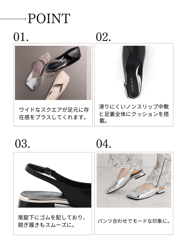幅が広めのスクエアトゥは履くだけで足元に存在感をプラス。つま先からのサイドスリットが涼しげでありながら、斜めカットラインが足元をすっきりとシャープにみせてくれます。