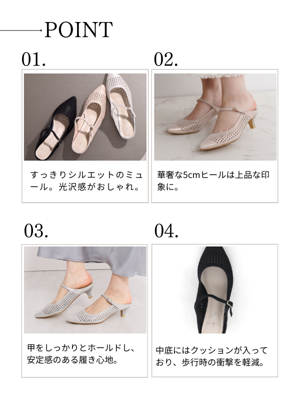 涼やかなメッシュとカットワークレザーで、程よい抜け感とメリハリをプラスした上品なミュール。