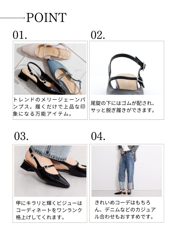 上品な輝きのビジューをあしらった尾錠が目を引くバックストラップパンプス。