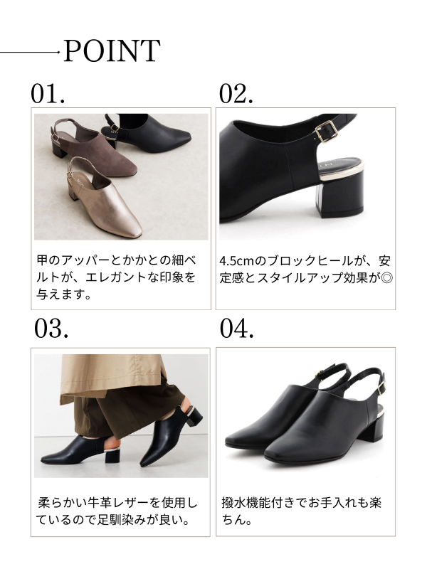 サンダルのようなリラックス感と正面から見た時のきちんと感がポイント。4.5cmのブロックヒールは安定感がありつつ、スタイルアップも叶えてくれます。 柔らかい牛革レザーを使用しているので足馴染みが良く、本革ならではのソフトな履き心地です。 ゴールドは暗くなりがちな秋冬のスタイリングのポイントに小物で取り入れたいおすすめカラー。
