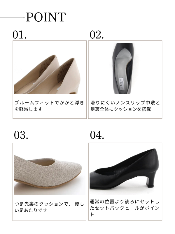 通常の位置より後ろにセットしたセットバックヒールがポイント。 程よい高さで安定感のある履き心地ながら、足元をすっきりと美しく演出してくれます。 撥水ヌバックレザーのDグレーとトレンドの千鳥柄の生地を使ったベージュ/Cが25AW新色で登場。装飾を省いたシンプルなデザインが様々なシーンにおすすめの一足です。