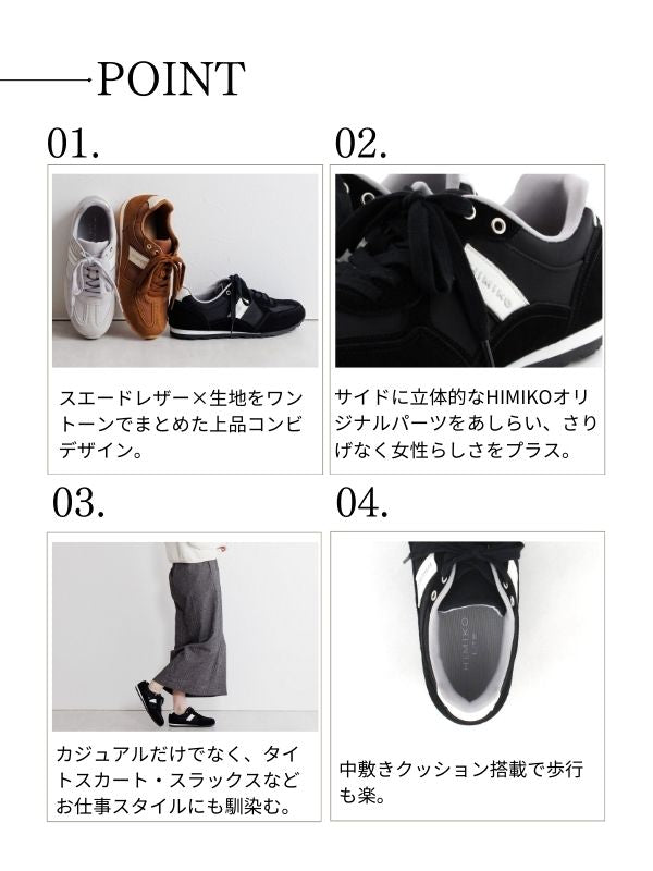 スエードレザーと生地のワントーンにまとまったコンビネーションデザインが、どんなスタイルにも合わせられる一足です。 サイドには立体的なHIMIKOオリジナルパーツを施し、ほのかに女性らしさをプラス。 スポーティーなブラック、秋冬にぴったりのブラウン、柔らかなカラーが一年を通して使いやすいグレーの3色展開。 カジュアルスタイルはもちろん、タイトスカートやスラックスと合わせてお仕事スタイルにも馴染む一足です。