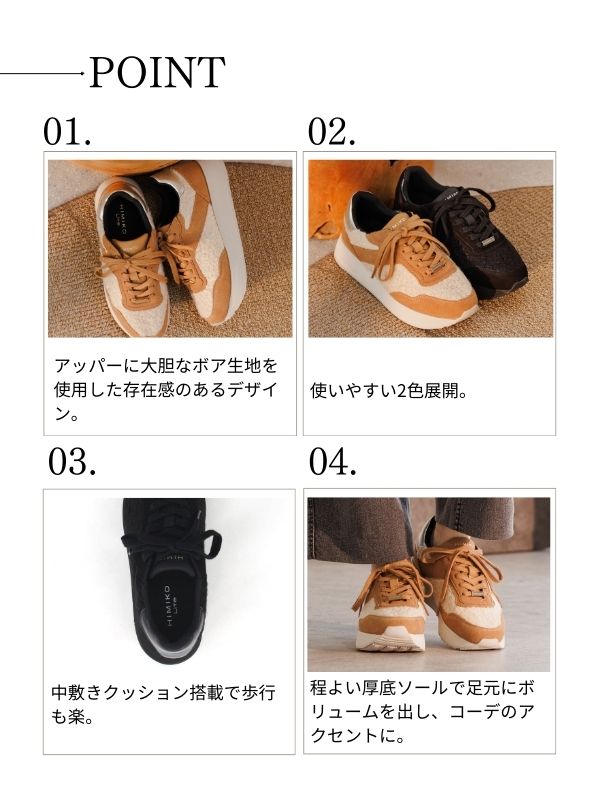 アッパーに大胆に使用したボア生地が目を引く一足。 カジュアルな印象ながら、スエードレザーとのコンビネーションにすることで高級感を演出し、大人が履けるデザインにこだわりました。程よい厚底ソールが足元にボリューム感を持たせ、コーディネートのポイントに。 ワントーンでまとめたブラック、ナチュラルなカラーコンビが可愛らしいブラウンの2色展開です。