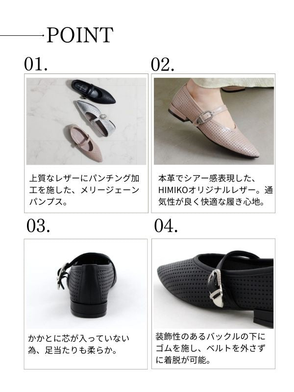 上質なレザーにパンチング加工を施したメリージェーンパンプス。シアー感を本革で表現したHIMIKOオリジナルレザーを使用しており通気性があるので、さらっと快適な履き心地なのも嬉しいポイントです。かかとに芯が入っていない為、足当たりも柔らか。装飾性のあるバックルの下にはゴムが施されており、ベルトを外さずに着脱が可能です。 春先はソックスと合わせて、夏には素足でラフにも履いていただけます。