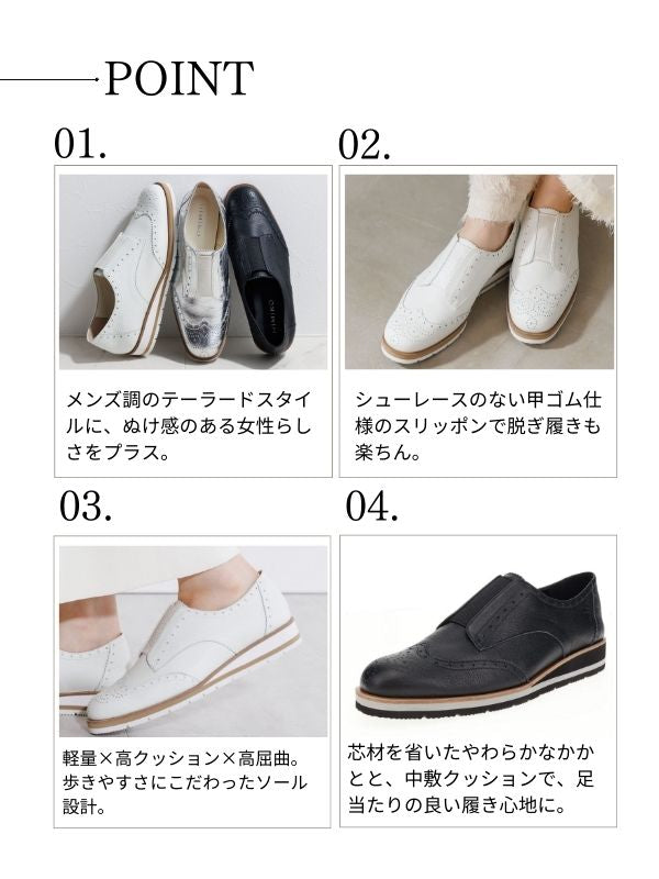 クッション性にも優れた軽量ソールが足裏からの衝撃を軽減し、屈曲性の高い設計で歩行時のカエリをサポートします。 かかと部分には芯材を入れず、柔らかな仕様。中敷全体にクッションを内蔵しソフトな履き心地を実現しました。 メダリオンデザインがカジュアルになり過ぎず、ドレッシーな足元に仕上がる一足です。