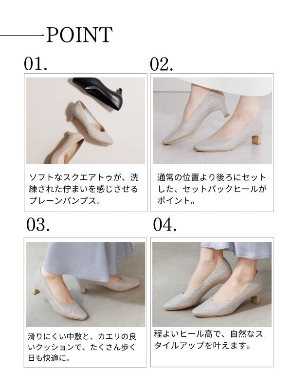 ソフトなスクエアトゥが大人の女性らしい洗練された佇まいを感じさせるプレーンパンプス。通常の位置より後ろにセットしたセットバックヒールがポイント。 程よい高さで安定感のある履き心地ながら、足元をすっきりと美しく演出してくれます。ブラック、ベージュはデイリーに使えるスムースレザー、シルバーはメタリックの糸が織り込まれた生地を使用。装飾を省いたシンプルなデザインが様々なシーンにおすすめの一足です。